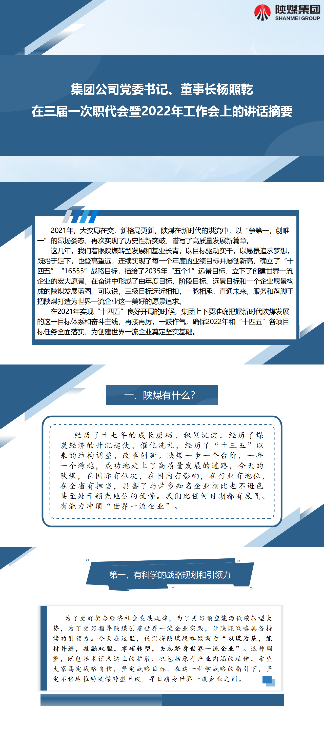 集團(tuán)公司黨委書記、董事長楊照乾在三屆一次職代會暨2022年工作會上的講話摘要
